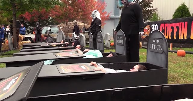 If you step out of your coffin for any reason, other than during designated breaks, you will automatically be disqualified. According to a press release, you might also have some guests in your coffin, such as “scary slithering reptiles” or “munching on giant cockroaches.” And, judging by photos from prior years, you may also have some pretty scary visitors stopping by as well. No, not your kids. People dressed in super frightening costumes ready to spook you out of your tomb.