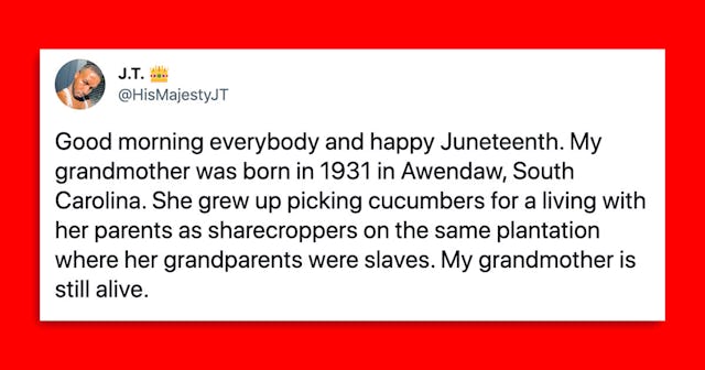 In a viral Twitter thread, @HisMajestyJT puts the timeline of slavery into perspective by pointing out that it wasn’t that long ago.
