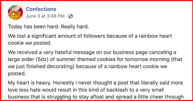 Confections bakery in Lufkin, Texas had quite a week last week, and got to experience that intense emotional whiplash that is so familiar to queer folks. It all started on June 2, when they posted an image of their adorable heart-shaped sugar cookies with rainbow frosting, along with a status that said, “More LOVE. Less hate. Happy Pride to all our LGBTQ friends! All lovers of cookies and happiness are welcome here.”