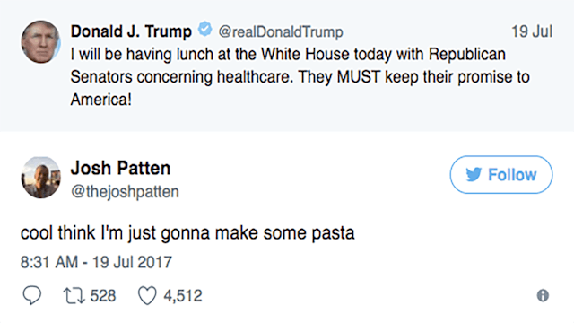 Patten has been responding to Trump’s infamous, insane tweets as though they’re texts. Basically, he’s taking Trump’s incoherent nonsense and poking fun at it like the rest of us, but in a uniquely humorous way. So far, he’s casually thrown out lunch ideas and Netflix suggestions directly to Trump’s tweets, no matter how off-the-wall or unrelated they are.