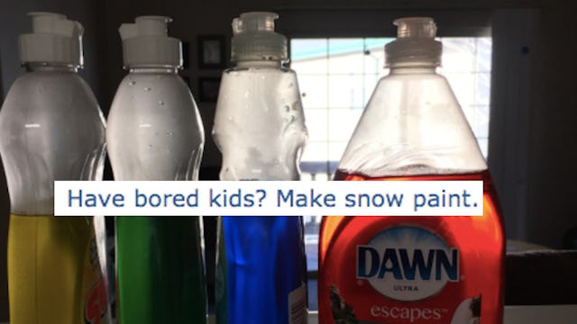 For parents, enduring the winter season with young children can be brutal. Gone are the days of playing outside in the sunshine for hours and burning off energy. If you live in a cold winter climate, you know the struggle (for kids and parents alike) of being stuck inside for months at a time, which is why this “snow paint” idea one mom recently shared on Reddit is pure genius.