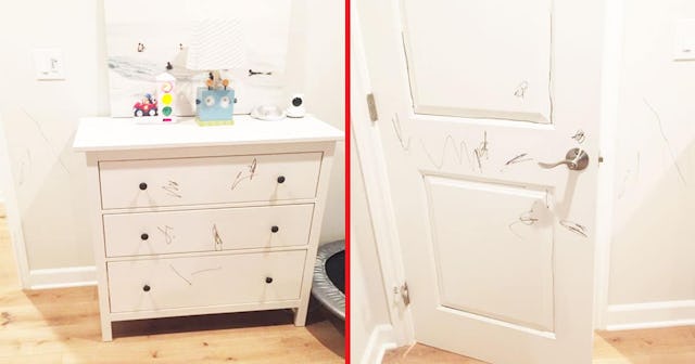 I am a woman of many words, but right then, I had no idea what to say. I was angry and confused and unsure of how to reprimand him. Do I scream? How do I let him know how terrible an action this was to do? I looked at his face and my heart sunk. He was SO PROUD. He loved what he had done and genuinely thought I would too. At that point, I took a deep breath and said, “This is not okay, we do not draw on our walls or bed. I need you to help me clean this up.”