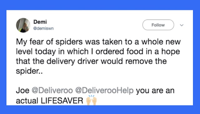 A woman in Bournemouth, England has officially won the internet for introducing us all to a brand new, ridiculously genius life hack. And it’s all thanks to really scary spider, a special food order, and a very brave deliveryman.