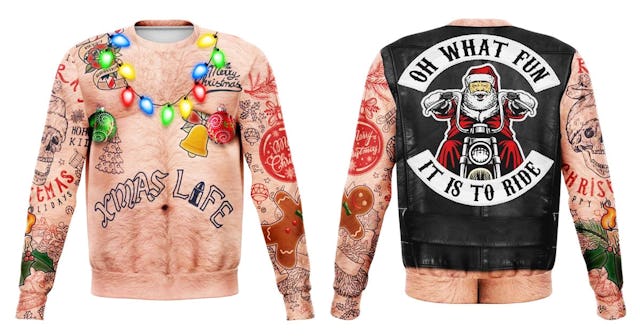 Perhaps you’re more of a ride-or-die Christmas enthusiast, in which case, this Tattoed Ugly Christmas Sweater with more of a motorcycle vibe is for you. It has all the same festive tattoos as the first sweater, but with Bonus Butt Crack included there at the bottom, as you can see below. Buy one for grandma — she’ll love it. What fun it is to ride, indeed.