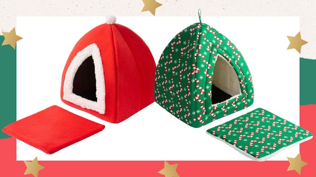 Made from super cozy materials like printed flannel and an interior filling of arctic velvet (which sounds like what you would wear to a ball at the North Pole), this enclosed space will keep your cat warmed to the purrrr-fect temperature from his own body heat. Which kind of makes this pet bed the cat’s pajamas.