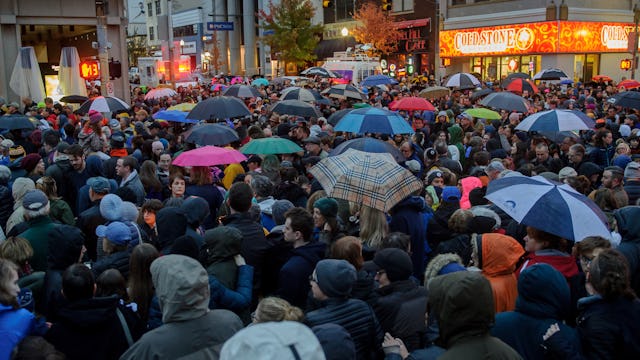 “This is a vigil arranged by high school kids on the spur of the moment, supported by law enforcement, and attended by hundreds and hundreds of members of my community,” he writes. “Christians, Jews, Muslims, Buddhists, Hindus, Atheists. People standing in the rain. People offering their neighbors comfort and support.”