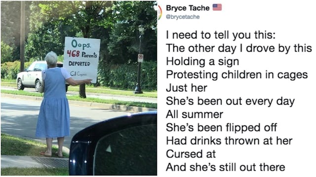Tache recently spotted one woman protesting alone and tweeted out a picture of her. He wrote that she has been cursed at, flipped off, and had drinks thrown on her, but is still standing there. The snapshot of her quickly went viral, with almost 100,000 likes on Twitter.