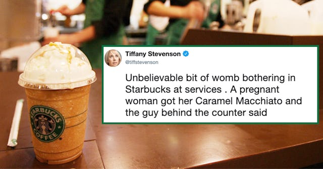 There’s no better example than this one, where Tiffany Stevenson, a comedian and third-party observer to a very infuriating exchange, had to look on in shock as a Starbucks barista in the United Kingdom tried to stop the pregnant woman in front of her from ordering a coffee drink. “Unbelievable bit of womb bothering in Starbucks at services,” she tweets. “A pregnant woman got her Caramel Macchiato and the guy behind the counter said ‘Oh , it’s for you. Do you want me to make a decaf?’ She said ‘No, thanks’ Him ‘No I should because caffeine is bad for the baby,’” and now our heads have exploded.
