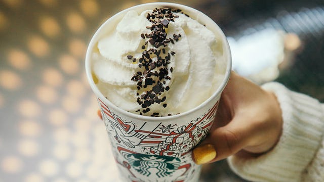 There’s the Black and White Mocha, which is hot espresso, poured over dark mocha sauce and white chocolate mocha sauce combined with steamed milk. It comes with chocolate “sequins” designed to look like a black tie, giving it extra fancy points. Whip or no whip, be sure to get yourself some candy sequins.