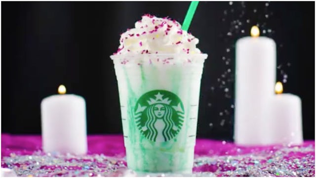 Starbucks’ new line is called “Crystal Ball Frappuccino,” and it’s made from — per the company’s rep — “crème-based Frappuccino infused with peach flavor and turquoise sparkles that create an enchanting marbling effect.” Are you almost sold? Now enter: the magic candy gems. Each drink comes sprinkled with sparkly bits of wonder, colored to represent a different life prediction. The blue candy gems promise adventure, green gems symbolize good luck, and purple gems are packed with magic (which allegedly includes “wonder, enchantment…and owls”).