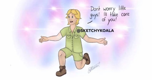 The illustration shows the late Crocodile Hunter and famous conservationist Steve Irwin greeting the poor animals that have succumbed to the fires, including kangaroos, koalas and others. Kneeling down with his arms wide open, Irwin can be seen saying: “Don’t worry little guys! I’ll take care of you!”