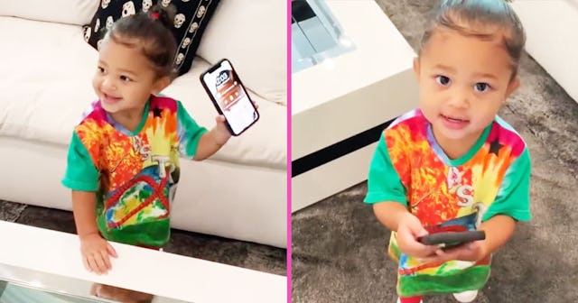 The phone is playing a fan-made techno version of the literal one-line song and Stormi’s happily grooving along until the record-scratch moment where she decides she would rather listen to dad Travis Scott’s music. “Daddy sing! Daddy sing!” she coos. “No baby, that’s Mommy!” Jenner chimes in. She asks Stormi if she’s “not good enough” and like, clearly, she’s not — this little girl wants to hear Daddy’s songs, sorry not sorry.