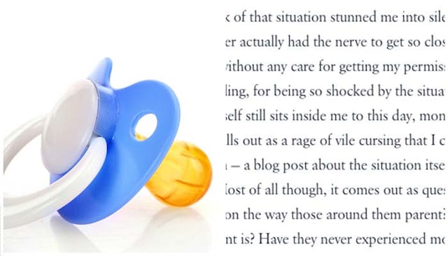 “Out of nowhere, an older woman approached us. She reached out, promptly plucking the dummy out of the gremlin’s unsuspecting mouth while scolding me about how he doesn’t need it and I shouldn’t be so bad a parent as to give it to him. Stunned silence (from both the gremlin and I) met this proclamation, though I suspect he was more stunned that a stranger had come near him and his precious dummy was suddenly gone than by anything that had been said. Before I had so much as attempted to gather myself to respond, the woman walked off with his dummy in hand!”