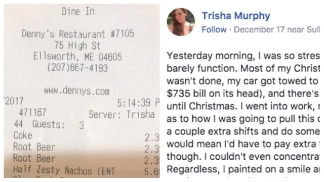 The man’s total came to $38.49. Which means, if you’re not a garbage human, a 20% tip should be about $7 or so. But not for this guy — he left Murphy a whopping $500. She said she had tears in her eyes while she thanked him. “He came back in to make sure I didn’t have a heart attack. I still might! I don’t know this man’s name, but I hope he realizes that he literally saved Christmas for my children and I! Good people do still exist. Yesterday was the day I met Santa!”