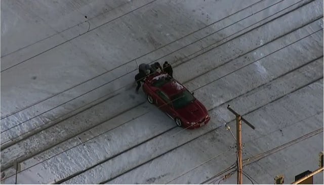 A group of people helped push a car off of snowy train tracks in Portland