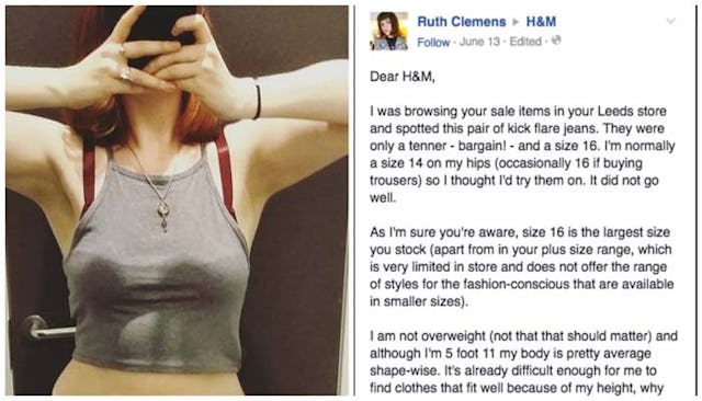 “I was browsing your sale items in your Leeds store and spotted this pair of kick flare jeans. They were only a tenner – bargain! – and a size 16. I’m normally a size 14 on my hips (occasionally 16 if buying trousers) so I thought I’d try them on,” she wrote on a post to H&M’s Facebook page. “It did not go well.”