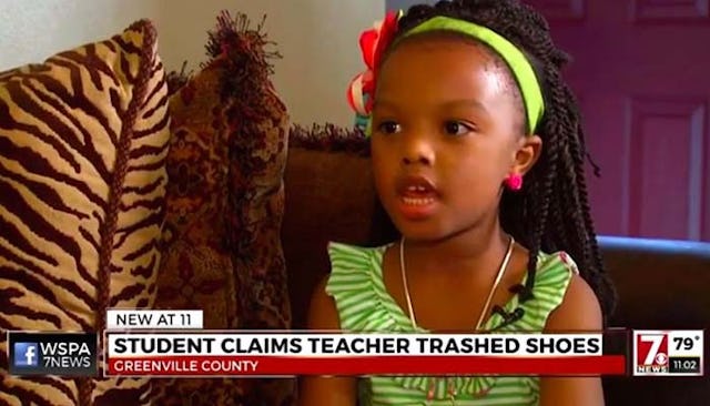 Alas, that’s what a first grader is claiming happened in her South Carolina school. Six-year old Taraji Edwards says her teacher made her throw her shoes in the trash after she wouldn’t stop fidgeting with them. In an interview with WSPA, Edwards totally owns her part in the matter. You know, with all that shoe fidgeting.