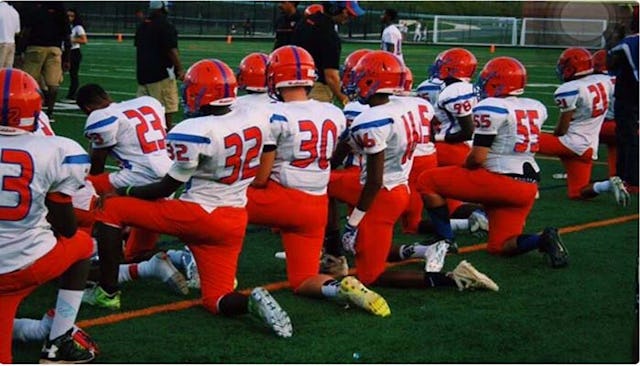 The story has dominated the news lately, so it comes as no surprise that the issue has trickled down to our kids. High school students across the country — some football players, some not — have joined in the protest. At some schools, the staff have gone beyond just allowing the kids to protest and have instead gotten involved themselves. At Woodrow Wilson high school in Camden, New Jersey, for example, coaches chose to take a knee during the anthem alongside their players. Said coach Preston Brown: “This was our way of saying that things have to change in our country. There’s oppression, there’s social injustice, and these kids live it.”