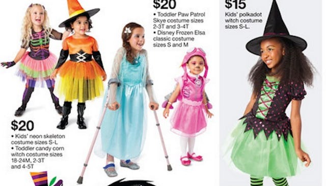 The retailer’s most recent Halloween advertisement features an Elsa costume modeled by a little girl who has leg braces and arm crutches. According to Jezebel, the ad started getting attention over the weekend when it was shared on Facebook by Jen Kroll, a mom whose daughter has arm braces and prosthetic legs.