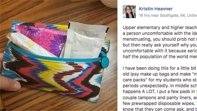 Kristin Heavner, a teacher at University Prep Academy Middle School, shared a photo on Facebook of the adorable “menstruation care packs” she makes for her students who get their first surprise visits from Aunt Flo at school. She repurposes cute, patterned makeup bags from the makeup subscription service Ipsy, and packs each one pads, tampons, panty liners and individually wrapped wet wipes.