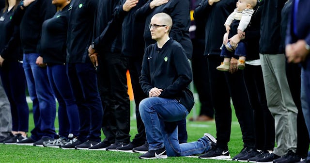 “Like many before, I respectfully kneeled during Nat’l Anthem because, ‘No one is free until we are all free,'” she wrote. That was pretty clearly in reference to Colin Kaepernick, who has used that quote from Dr. Martin Luther King, Jr. frequently in his ongoing protests against police brutality, which began with him kneeling during the anthem at San Francisco 49ers games in 2016. Kaepernick was fired from his position as quarterback on the team for his protests, and the NFL created new rules that banned other players from kneeling during the anthem.