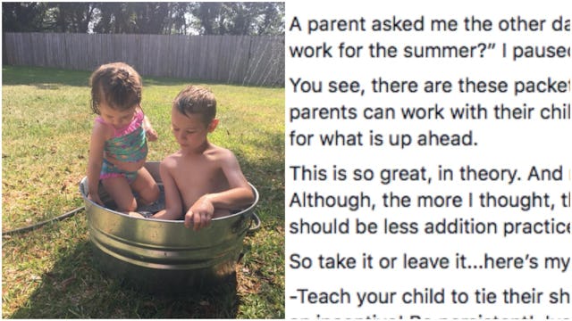 Any parent of school-aged kids has heard of (or experienced in all its glory) the “summer slide,” which basically means they leave school on their last day and immediately forget every single thing they learned during the year. And while many teachers and parents believe their kids should be continuing their education during the summer months by reading books and completing math packets, one teacher had some very different and very refreshing advice.