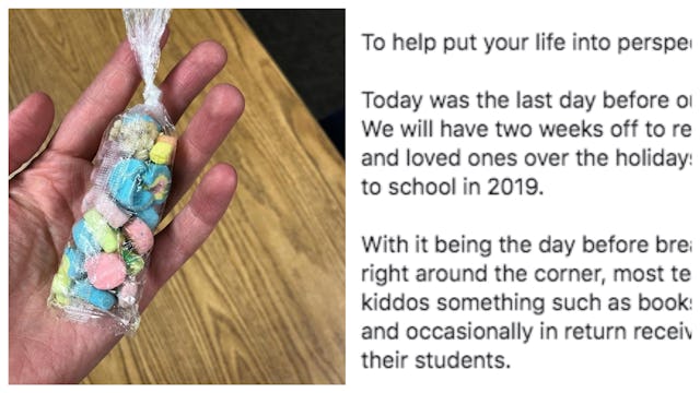 In a touching Facebook post, an elementary school teacher says she receives many small gifts this time of year from her students. But it was one small gift — a tiny bag of Lucky Charms marshmallows — that will stay with her, and all of us, through the holiday season.