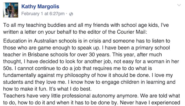 Kathy Margolis posted the open letter on Tuesday and says it’s a copy of one she wrote to the Courier-Mail. In it, she takes the school system to task for what she calls a “crisis” in education and says “someone has to listen to those who are game enough to speak up.” She explains that she’s decided to look for a new job — something she describes as “not easy for a woman in her 50s” — because she “cannot continue to do a job that requires me to do what is fundamentally against my philosophy of how it should be done.” From her Facebook post: