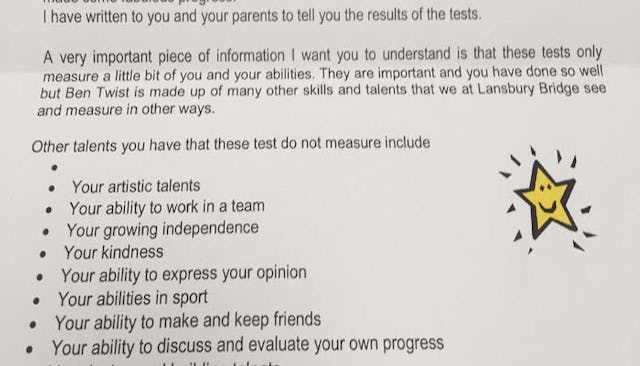 “A very important piece of information I want you to understand is that these tests only measure a little bit of you and your abilities,” the letter reads. “They are important and you have done so well but Ben Twist is made up of many other skills and talents that we at Lansbury Bridge see and measure in other ways.”