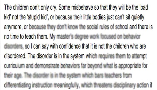 “The children don’t only cry. Some misbehave so that they will be the ‘bad kid’ not the ‘stupid kid’, or because their little bodies just can’t sit quietly anymore, or because they don’t know the social rules of school and there is no time to teach them. My master’s degree work focused on behavior disorders, so I can say with confidence that it is not the children who are disordered. The disorder is in the system which requires them to attempt curriculum and demonstrate behaviors far beyond what is appropriate for their age.”