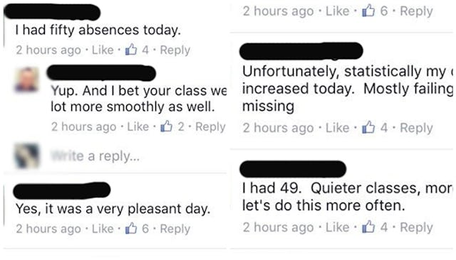 One teacher claimed the students were using the strike “as an excuse to be lazy and/or get drunk,” and others joined his thread to rejoice about how much more enjoyable their day was with fewer “failing students,” a cleaner cafeteria, and less traffic.