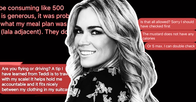 Since surviving the horror of a little additional body fat, she’s committed herself to making everyone’s life as fulfilling as hers — and clearly the only way you can be totally fulfilled is to be skinny. So she started her own business being an “accountability coach.” When she first mentioned it on the show, I just thought it sounded like some sort of made up job someone with enough money to not work but who still needed to feel useful gave themselves. I was pretty close. It turns out being an accountability coach equals daily chiding people for eating too much and not exercising enough. Fun. I know this, because people who have been through the program are starting to anonymously share how horrifying it is. Why anonymously? Because Teddi makes all participants sign non-disclosure agreements for the right to pay her $600 to starve.
