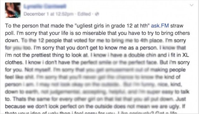 Buzzfeed reports high school senior Lynelle Cantwell was sitting in math class when she learned her name was on a cruel list intended to rank the “ugliest” girls in school. The list was created on Straw Poll — a website that allows users to create anonymous polls — and then shared on Ask.fm. By the time Cantwell saw it, there were over a hundred anonymous votes and she was ranked in fourth place. Two of her close friends also made the list.