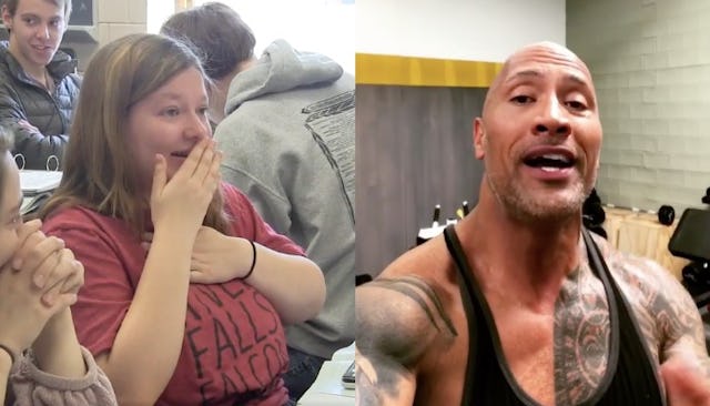 Yup. That’s Kelzenberg sitting in her classroom listening to the morning announcements only to hear The Freaking Rock responding personally to her prom invite.