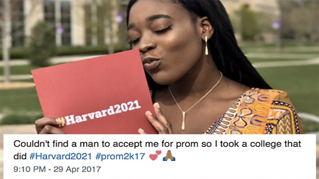 “Couldn’t find a man to accept me for prom so I took a college that did #Harvard2021 #prom2k17,” she wrote in a tweet, which has taken off with almost 30,000 retweets.