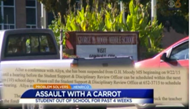 The incident happened at George H. Moody Middle School in Virginia. The student, 14-year-old Aliya Nigro, told the local news station that she saw a former teacher in the hall and as a joke tossed a carrot in her direction. She claims she didn’t realize it would hit her. Her mom, Karrie May, appeared on the news to talk about the charges: