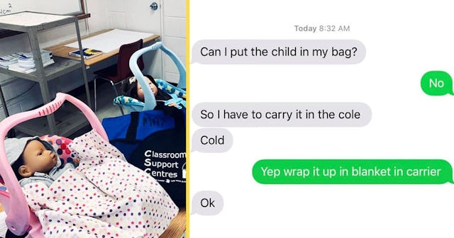 This student thought you could just toss the baby in a duffle bag and be on your way. If only real babies were that practical! Too bad they have to be able to, like, breathe and stuff.