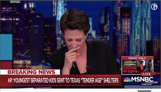 Yes, that’s the typically stoic and professional Maddow choking up and crying on air, unable to speak the awful realities happening at our country’s southern border. She later took to Twitter to apologize for breaking down and to share the news she was unable to read.