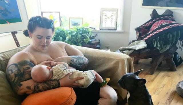 Holliday shared a sweet photo of herself breastfeeding Bowie this past September as a Tuesday throwback. To the outside eye the image captures a perfect moment — she’s rocking some amazing ribbon infused braids, the lighting is great, the house looks clean and calm. Her dog is adorable too, looking on to make sure the baby’s okay while he nurses.