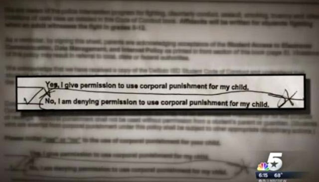 Without “permission” — corporal punishment is assault. God, even writing that feels absolutely gross. Unbelievable that in this country in 2016 you can sign a form that basically takes away your child’s right to not be physically assaulted. If Smith didn’t sign that form, the school had no right to dole out that punishment. Regardless of someone’s feelings about the practice, we should at least be able to agree that it can’t happen against a parent’s wishes.