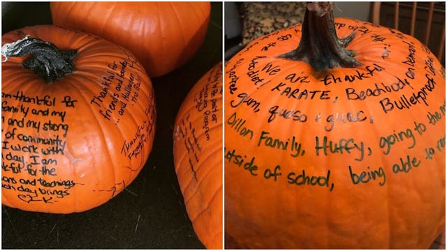 After sharing her idea online, the idea took off with families sharing their “Thankful Pumpkins” with others. It can be anything big or small, just the idea of taking time out to remember all you have is the point.