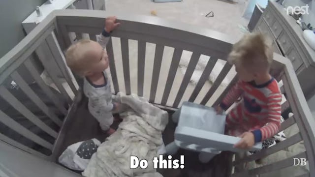 The Lanning brothers were caught on their parents’ nanny cam, finding a way to work around the pesky walls of the younger brother’s crib.
