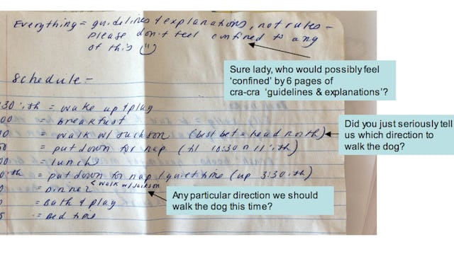 To ‘help’ them out, I put together what I thought was a helpful, information-packed list of all of the critical need-to-know items that they (and my daughter) would need to survive the next 10 days. As I now read it, 8 years (and a 2nd kid) later, I realize how thoroughly amusing this instruction sheet must have been to two intelligent, loving parents/grandparents who had already raised two boys of their own.