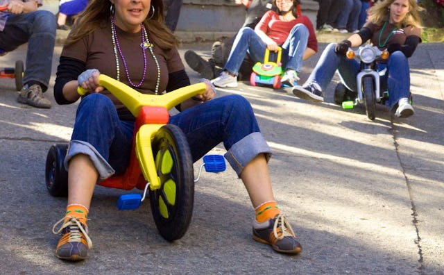 As for me, after all the wishing and waiting to be a grown-up, I can admit my assumptions were just plain wrong. Instead, I get to be the adult I want to be now: I can dye my hair blue, wear ripped jeans, feed my family breakfast for dinner and still be the woman who loves myself, loves my husband and children to infinity and beyond, and ends up in a family cuddle puddle on the couch every evening. I can even ride a Big Wheel if I want. In pigtails. Adulthood aside, at any age, that’s all the life I need.