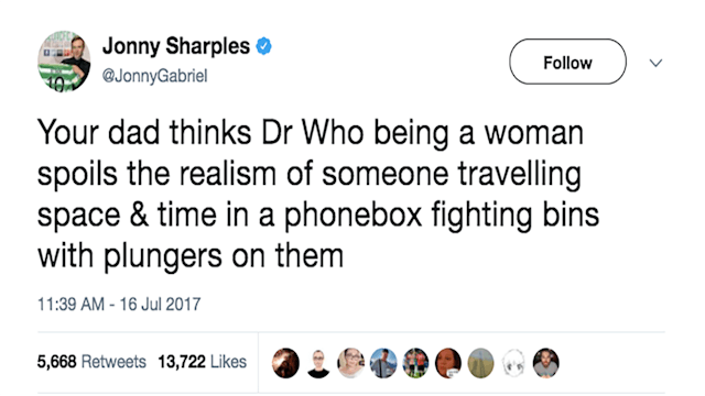 “I don’t even watch it, but the extraterrestrial being who accesses other portals in the universe by hopping into a police-phone-box-turned-space-ship should definitely be a man.” Okay, bro.