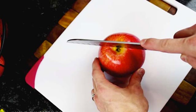 I’ve been cutting apples the same way my entire life, and I have no idea why. My painstaking process involves cutting them into quarters and hollowing out the core – then cutting them into eighths — don’t ask. But this new way removes the core seamlessly and also makes the apple fit together like a puzzle when you put it back together and bind it with a rubber band. This keeps the air from the fruit and the apple fresh — genius!