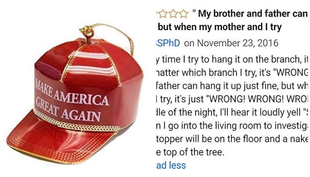 Heat up some leftovers, grab a mimosa and settle in for your new favorite thing to read: the Amazon reviews on Trump’s “Make America Great Again” Ornament. Regardless of who you voted for, the 3,818 customer reviews and 173 answered questions guarantee a good laugh.