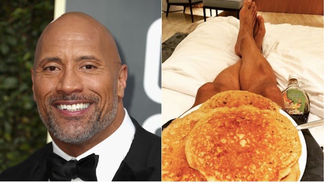 Johnson is obviously super into his fitness routine (drool) but everyone deserves a cheat day now and then, and let me tell you, this man does not half-ass it on days where his diet is shoved aside. He revels in the unchecked sugar and caloric intake of the occasional day off from his (probably usually strict) menu by eating all the pancakes he can get into his belly.