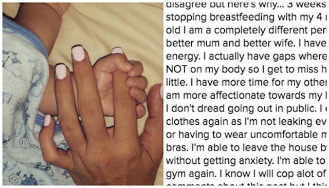 “I wish I never breastfed my baby,” Maddi Wright begins her post about breastfeeding her second child. “A strong statement and many would disagree but here’s why…” She explains that just three weeks after ceasing to breastfeed her four-month-old, she feels like a “completely different person.”