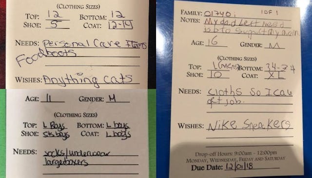 “My dad left need job to support my mom,” reads a tag from a 16-year-old boy. He needs clothes for his future job and wants Nike sneakers.